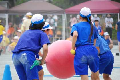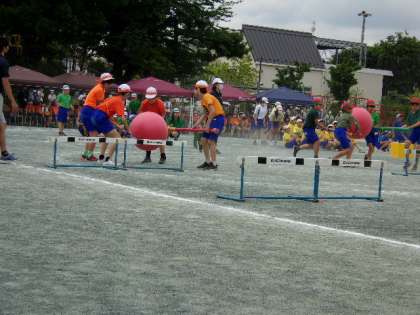 ただし、手で大玉を持ち上げるのではありません。二本の長い棒で大玉をはさみ、運びます。そしてただ運ぶだけではなく、なんとコース上にハードルが置いてあり、それをまたがねばならないのです!