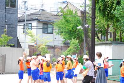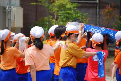 途中から出したミストや水道でタオルを濡らし、子供たちは競技の合間に涼をとっていました。
