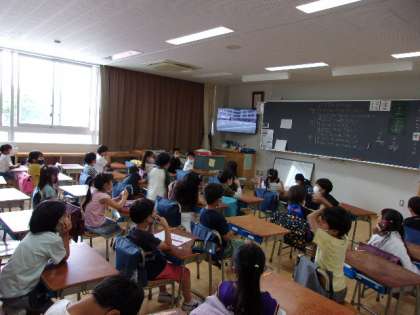 写真の最後の1枚は、教室で参観している1〜3年生の様子です。ちょっと暗くて分かりにくいのですが、競技中は一生懸命応援し、競技の結果が発表されると飛び上がって喜んでいる子もいました。