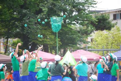 実際に玉入れをする前に、踊ります。1曲だけでなく、いろいろな曲に合わせて踊りました。