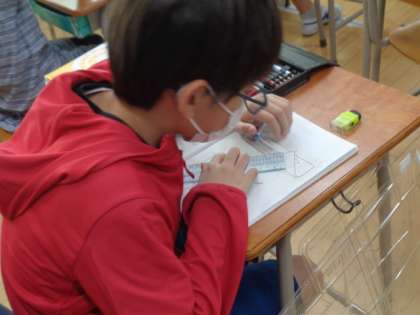 図形の学習です。「分度器、三角定規、コンパスなどどれを使ってもいいので、同じ三角形を描きましょう。」と先生から課題が出されました。すぐに取り組みはじめ、やる気いっぱいの様子でした。作図は1mmもずれないように完成させます。それが、難しさでもあり、おもしろさでもあります。集中してがんばっていました。