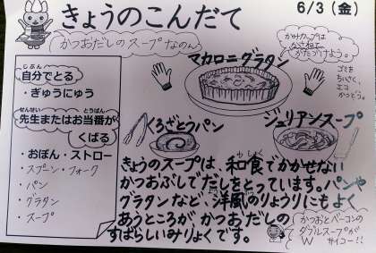 今日は、黒砂糖パン、マカロニグラタン、ジュリアンスープ、牛乳です。