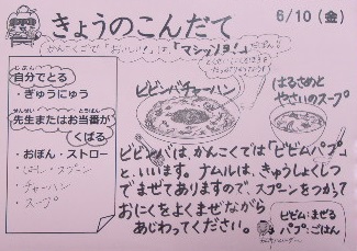 お店のメニューを見ると、「ビビンバ(ba)」と書いてあるものと、「ビビンパ(pa)」と書いてあるものがあり、不思議に思っていたのですが、今日の給食メモを見るとその謎が解けました。あれ、そうなると韓国語の発音に近いのは「ビビンパ(pa)」の方なのかな?個人的には「ビビンバ(ba)」の方がなじみ深いのですが。