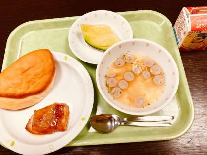 今日は、てりやきバーガー、にんにくたまごスープ、牛乳です。