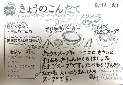 てりやきバーガーは、パンにチキンのてりやきを挟んでいただきます。みんなチキンとできたかな?メロンを挟んでメロンパンでも良いかもしれません。今日のメロンはアンデスメロン。このアンデスとはナンデス?アンデス山脈原産かと思ったら、なんと日本産なのだそうです。アンデスメロンは病気に強く、安く生産できるので、生産者も消費者も安心ですということで、「安心ですメロン」から「アンデスメロン」にしたのだそうです。そうすると「にんにく玉子スープ」は、「にんたまスープ」ですかね。何だろう、乱たろう。
