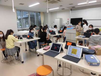 こちらも家庭科クラブです。タブレットを使って、コースター作りの出来上がりのイメージ図を描いていました。