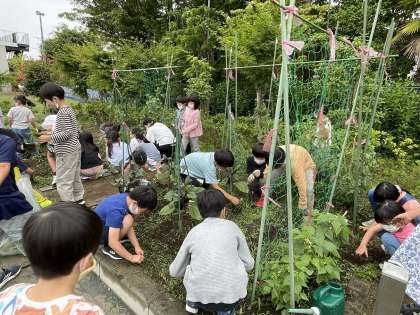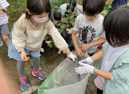 畑に集合して、雑草を抜きました。あっという間に袋は雑草でいっぱいになりました。畑作業をしてスッキリ!!おいしい野菜ができるのが楽しみです。