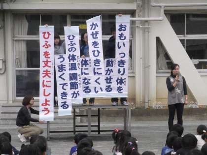 11月の保健目標は、「皮ふを丈夫にしよう!」です。寒暖差が大きくなり、だんだんと厚着をするようになりますが、なるべく薄着を心がけ、皮ふを強くすると、たくさんのいいことがあると土屋先生から教わりました。ぜひ、薄着を心がけたいと思います。詳しくは、今月の保健だよりをご覧ください。