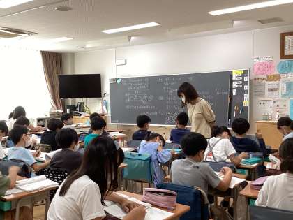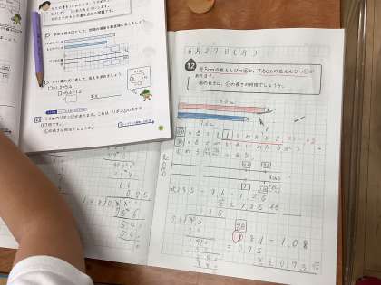 小数の割り算の単元です。文章問題を数直線を使って解いていました。ノートを見せてもらいましたが、自分の考えがとても分りやすく書けていました。じっくりと考えて問題に向き合っていて素晴らしいなと思いました。
