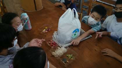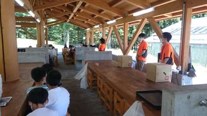 炊事場でおいしい空気を吸いながら、ハーバリウム体験をしています。