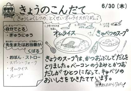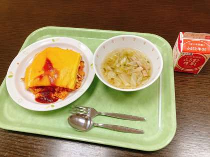 今日は、オムライス、キャベツのスープ、牛乳です。