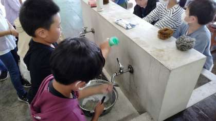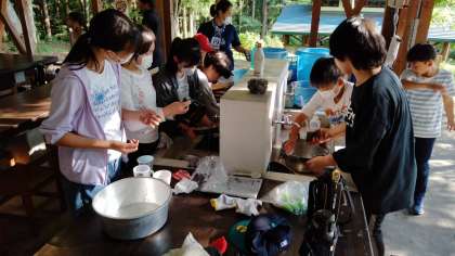 すすにまみれて黒くなった鍋や飯ごうを一生懸命洗いました。補助員さんの合格をもらうまで、がんばりました!