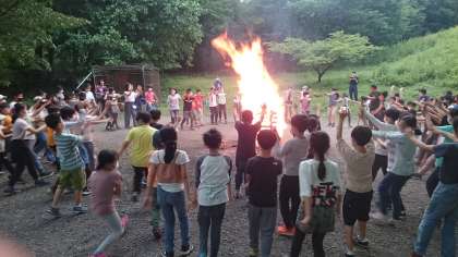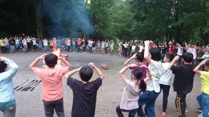 まだ明るい中でしたが、キャンプファイヤーを行いました。歌って踊って、とても盛り上がっていました。