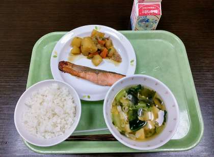 今日は、ご飯、鮭の麹焼き、肉じゃが、豆腐のみそ汁、牛乳です。