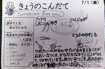 マスクを外では取る、熱から頭をまもるため帽子を被るとともに、食事でも体を整えて、暑さを乗り切りましょう。