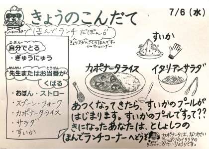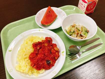 今日は、カポナータライス、イタリアンサラダ、すいか、牛乳です。