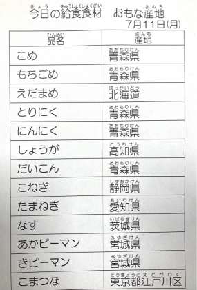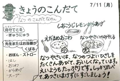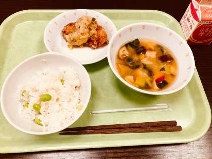 今日は、枝豆おこわ、塩麹レモンから揚げ、夏野菜のみそ汁、牛乳です。