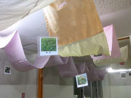 6年共同作品「自然で染める」家庭科室前の天井には自然にある植物から色を取り出して染めた布が飾られていました。そこには、何で染めたかの表示が。それをみて、びっくり。こんな色に染まるんだ、と自分でもやってみたくなりました。
