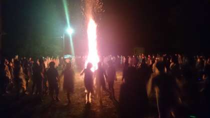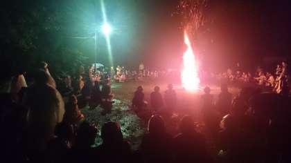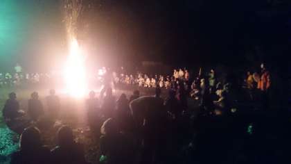 夕食中は大雨でしたが、止みそうな雲行きだったので、みんな合羽を着てキャンプファイヤー場へ。結局、小雨の中、キャンプファイヤーを楽しみました。