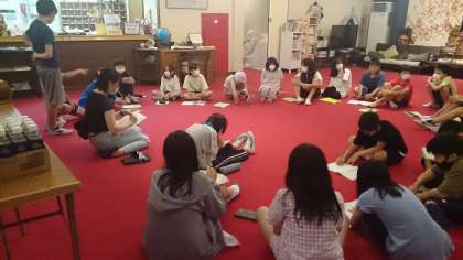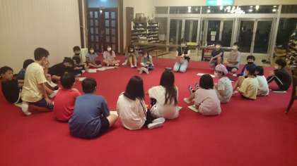 入浴、就寝準備をしたあと、ロビーで班長会議を行いました。明日の生活にいかせる反省がたくさん出されました。