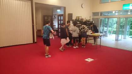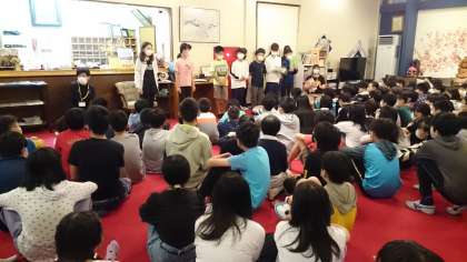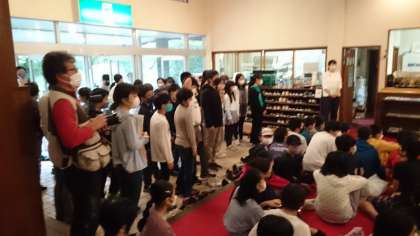 外は雨なので、梅屋敷のロビーで朝会をしました。1組と5組も梅屋敷に集合しました。
