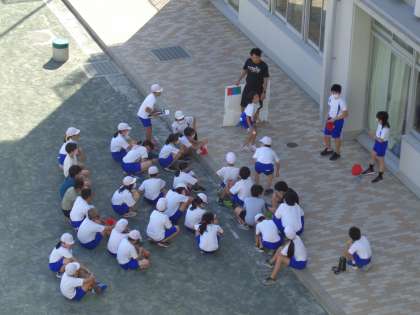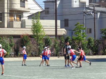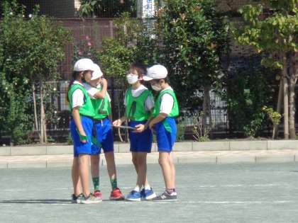 5年生の様子です。「タブラグビー」の第1回目の学習です。ルールやゲームのやり方を確認しながら活動していました。チームやクラスみんなで話し合いながら、みんなが納得してゲームをすすめていました。互いに声をかけ合う姿がすてきでした。