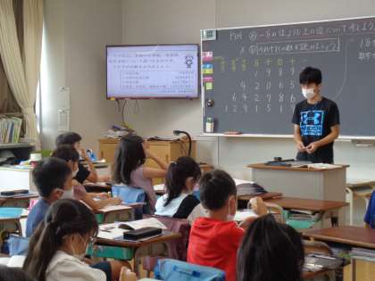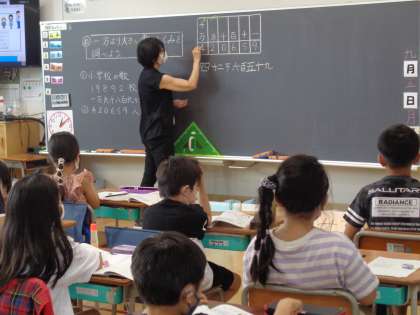 3年生の様子です。「10000より大きい数」の単元です。位取り表を書いて数の構成を理解していました。1年生は100までの数、2年生は、10000までの数、3年生は、さらに大きくなります。子供たちにとって、数を概念的にとらえるのは、とても難しいです。問題を解きながら、理解が深まっていきます。