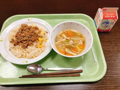 今日は、そぼろごはん、さつま汁、牛乳です。