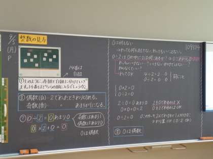 先生が、子供たちの意見をまとめながら黒板に書いていました。「0は偶数である」ということが証明されていく様子が黒板から分かりました。