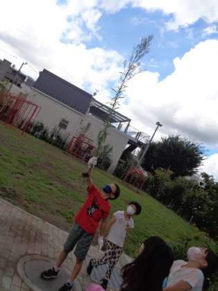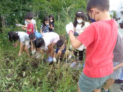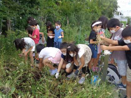 秋の野菜を植えるために畑の草取りをしました。畑は、夏休みの間に雑草がこんもりと茂っています。みんなで、どんどん抜いて大きな袋はあっという間にいっぱいになりました。畑もスッキリ!!