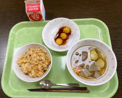 今日は、かやくご飯、お月見のっぺい汁、ぐつのみたらしだんご、牛乳です。