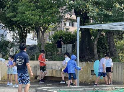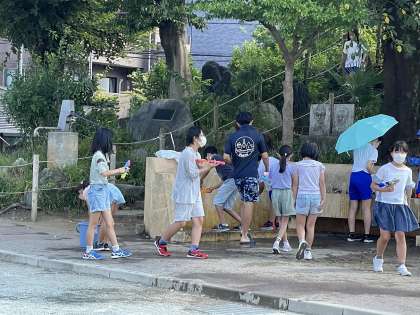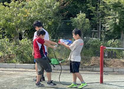 今日は、1年に一度のお楽しみ「水遊び」です。それぞれが持ってきた水鉄砲やバケツで水を掛け合っていました。気温が高くとても気持ちよさそうでした。担当の先生もびしょ濡れでした。