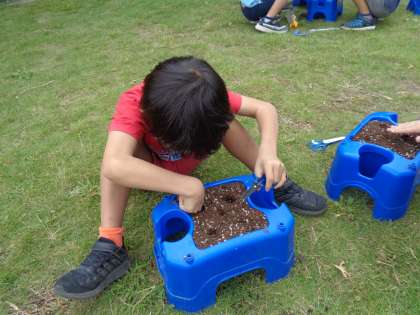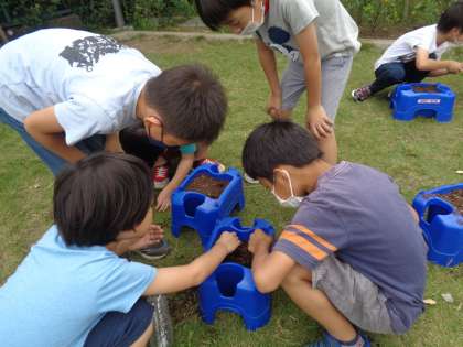 1学期はミニトマトを育てていた自分の植木鉢に、秋野菜の種を植えていました。2学期は、「かぶ」を育てます。小さな小さな種を5粒植えました。「こんなに小さな種が本当にかぶになるのかな・・・」と不思議に思っている子もいました。