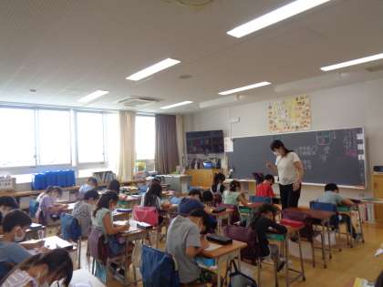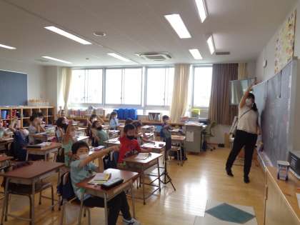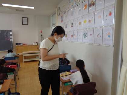 漢字の学習をしていました。はねるところ、はらうところなど、みんなで確認しながら書いていました。これだけ丁寧に学習したら、字も丁寧に書けるようになるでしょう。子供たちの集中力も素晴らしかったです。