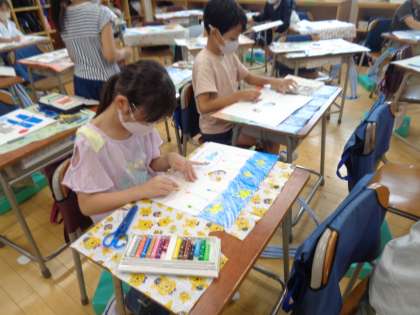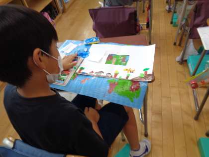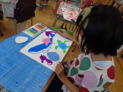 題材名『あなのむこうはふしぎなせかい』です。画用紙の真ん中を好きな形に穴を開けて、こちら側とあちら側の両面にまったく違った世界をクレパスで描きました。穴を洞窟み見立てたり、海の世界から宇宙の世界に変わったりと、想像力いっぱいに描いていました。