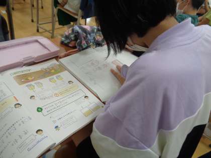 「分数」の単元です。分数のたし算をどうやって計算するのか自分の考えをノートに書いていました。その考えを発表し合って、自分の考えを深めていきました。