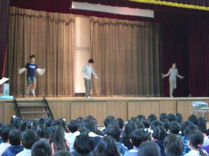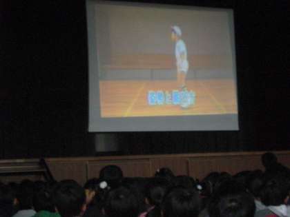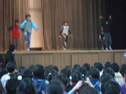 短なわ跳び朝会が、雨天のため、体育館でのなわ跳びの技の紹介に
