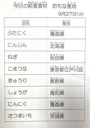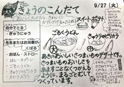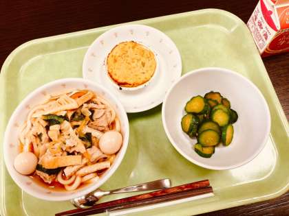 今日は、五目うどん、きゅうりのピリカラ、スィートポテト、牛乳です。