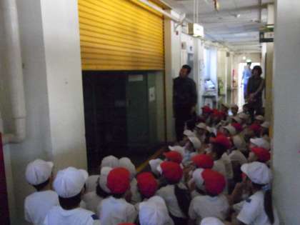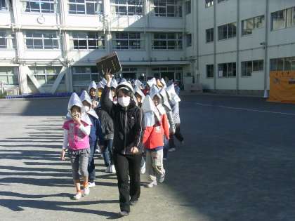 今日は、主事室からの出火という想定の避難訓練でした。5分余りで、全児童(今日の避難児童数885人)が避難完了。整然と訓練を終えることができました。その後、4,5年生は校庭の片隅に建てられたテントで、煙体験です。実際に煙が出たら、ほとんど視界が利かないということを実体験できました。みんな、びっくりです。1年生は、階段のところにある防火シャッターが下りてくるのを見学しました。シャッターの下敷きにならないようにと、先生からしっかりと教えてもらっていました。