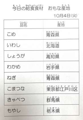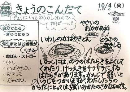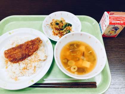 今日は、鰯の蒲焼丼、豆腐のみそ汁、野菜のおかかあえ、牛乳です。