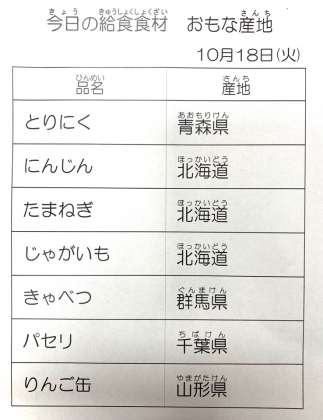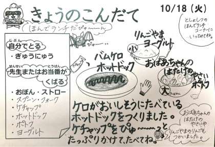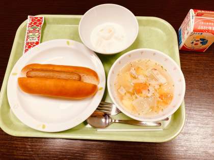 今日は、バムケロホットドッグ、おばあちゃんのはたけの野菜ポトフ、りんごやまヨーグルト、牛乳です。