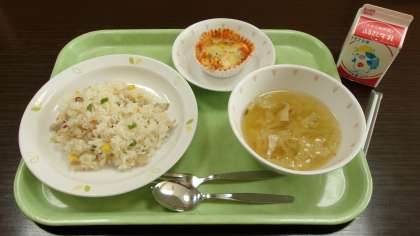 今日は、カラフルピラフ、トーフミートグラタン、野菜スープ、牛乳です。