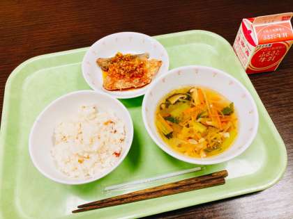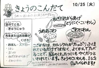 今日は、梅おこわ、ねぎだれから揚げ(鶏肉・小いわし)、沢煮わん、牛乳です。
