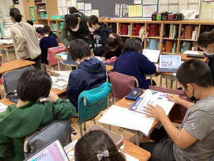 太鼓や笛など日本の音楽について本やタブレットでの検索を参考にして書いていましたが、新聞のレイアウトの仕方など「さすが、高学年!」という出来映えでした。