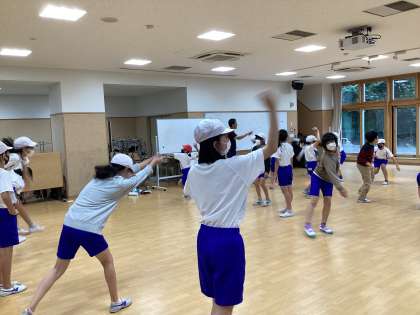 「イメージを体で表現しよう」というめあてで、多目的室で行っていました。2人組になって「自分は、バレーボールの名選手である。」という設定で、スパイクを打つ人とレシーブを受ける人の役になって体を動かしていました。