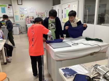 ナップザックを作っているところです。縫う前に、生地に刺繍やポケットを縫い付けてから裏返しにして、印をつけたところをミシンで縫っていきます。火傷に気を付けながらアイロンを慎重にあてていました。