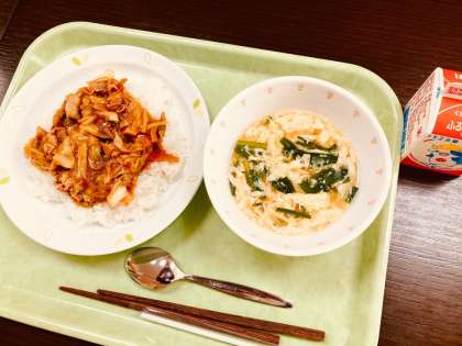 今日は、回鍋肉(ホイコーロー)丼、ニラ玉スープ、牛乳です。