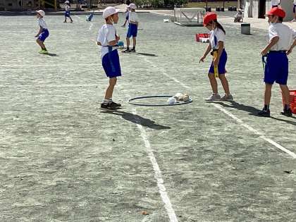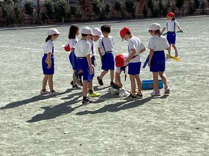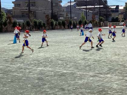 校庭にコートを作り、その中でチームごとに「とうそうちゅう」というゲームを行っていました。腰につけているタグを取られずにゴールできたら、得点が入れられます。チームごとに作戦を考えて行っていました。