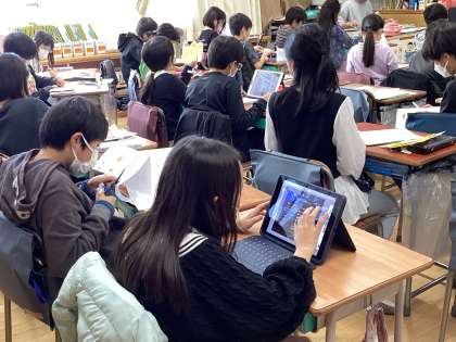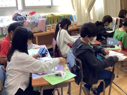 「日本の衣食住」の中から興味のあるテーマを選び、本やタブレットを使って調べてきたことをパンフレットにまとめていました。印刷したイラストや写真を切り貼りして思い思いの作品に仕上がりました。