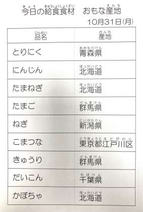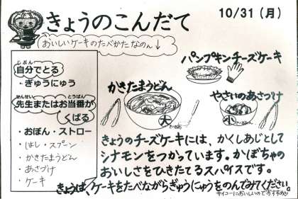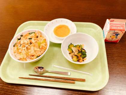 今日は、かき玉うどん、野菜の浅漬け、パンプキンチーズケーキ、牛乳です。